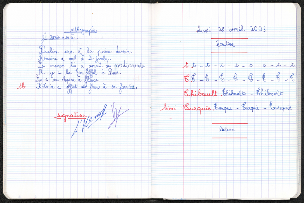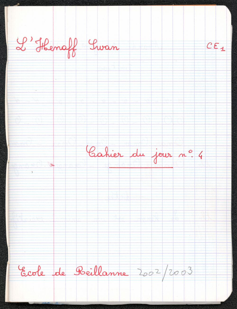 Notes : Cahier du jour n°4 appartenant à Swan L'Hénaff, scolarisé en classe de CE1 à l'école de Reillanne (04) pour l'année scolaire 2002-2003.