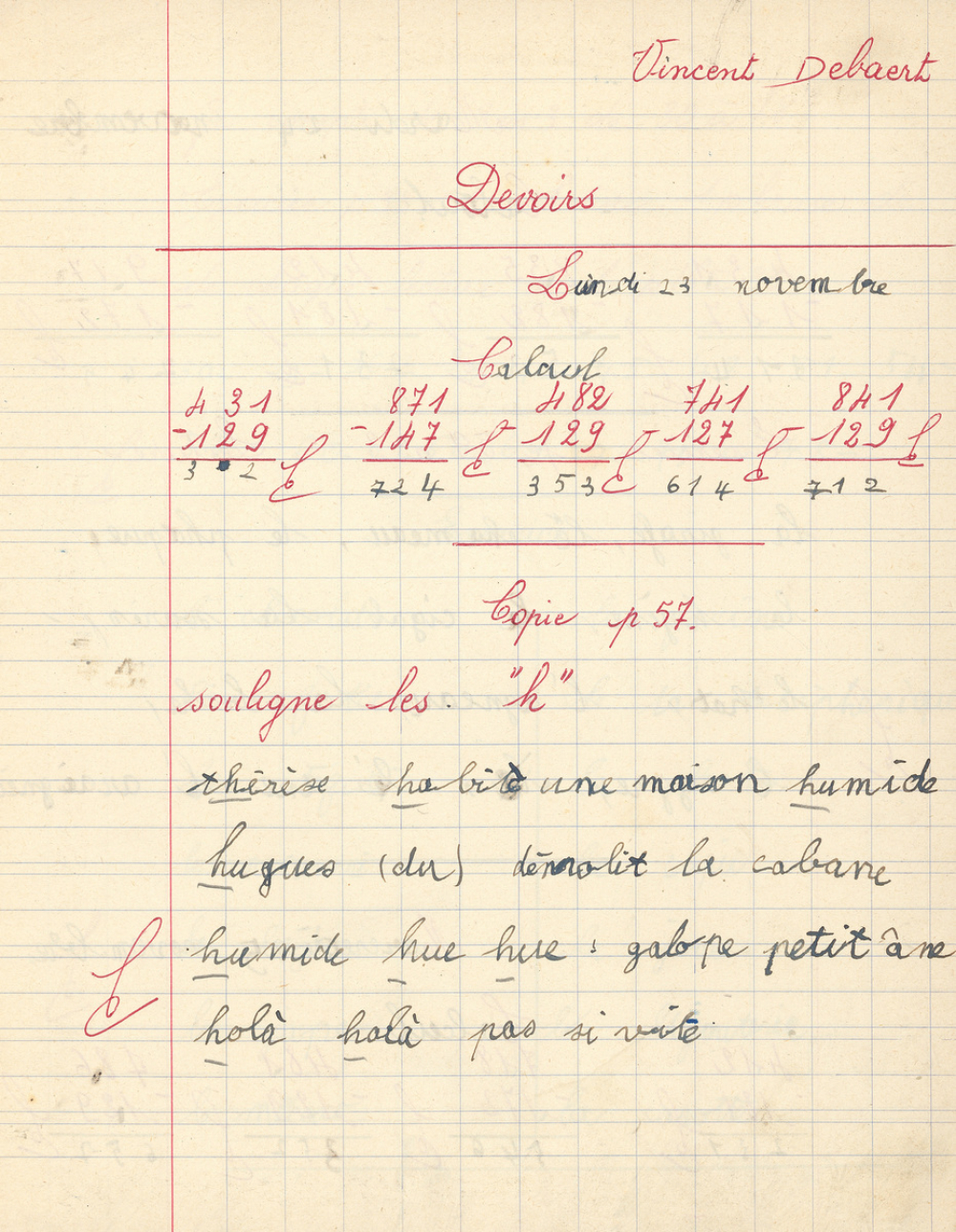 Notes : Devoirs. Calcul. Exercice. Copie. (vocabulaire illustré) La clé. La bicyclette. Le tableau. Un épi de blé.Conjugaison.
