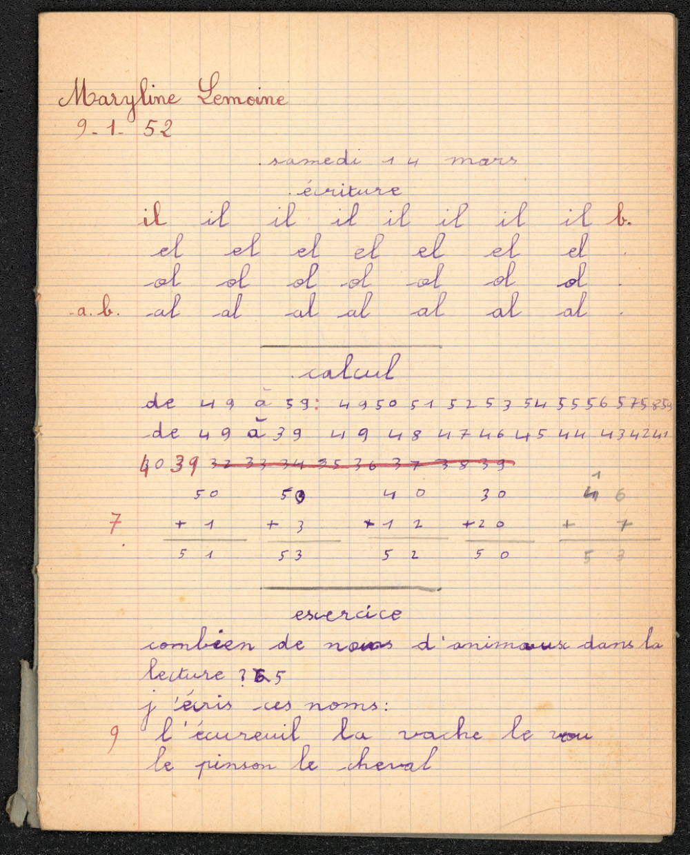Notes : Il s'agit du quatrième cahier journalier de l'élève Maryline Lemoine, probablement scolarisée en classe de 11e du cours pratique à l'école des filles (Jules Ferry) de Sartrouville dirigée par Mme Huard, durant l'année scolaire 1958-1959.