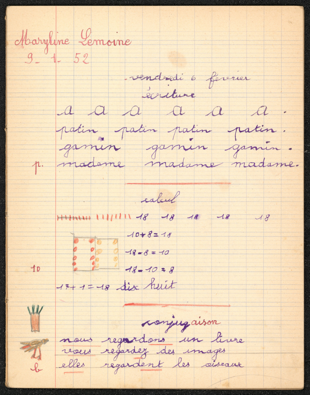 Notes : Il s'agit du troisième cahier journalier de l'élève Maryline Lemoine, probablement scolarisée en classe de 11e du cours pratique à l'école des filles (Jules Ferry) de Sartrouville dirigée par Mme Huard, durant l'année scolaire 1958-1959.