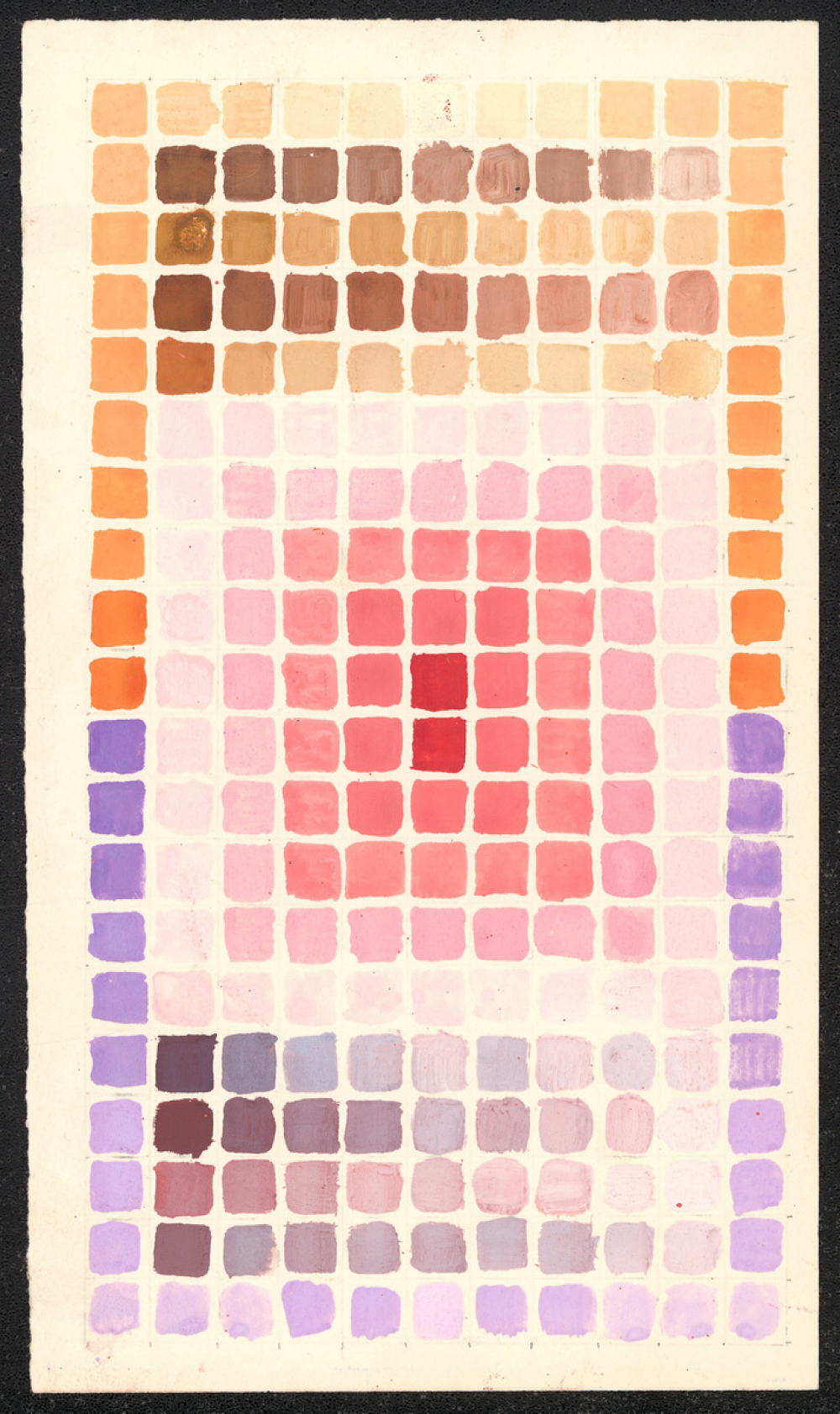 Représentations : carré / 220 petits carrés sont assemblés par 11 de largeur et 20 de hauteur. Au centre, sur 9 carrés de large et 10 de haut, ils forment un dégradé de couleur, qui part de deux carrés rouges au centre pour finir rose très clair aux extrémités. Les carrés qui délimitent l'ensemble de la figure forment un dégradé d'orange pour la moitié supérieure de la feuille et de violet pour la moitié inférieure, les couleurs les plus claires étant sur la largeur et les plus foncées sur la hauteur. Sur la partie supérieure se trouve un dégradé de marron de 9 carrés de large sur 4 de haut, et sur la partie inférieure un dégradé de violet de même dimension.