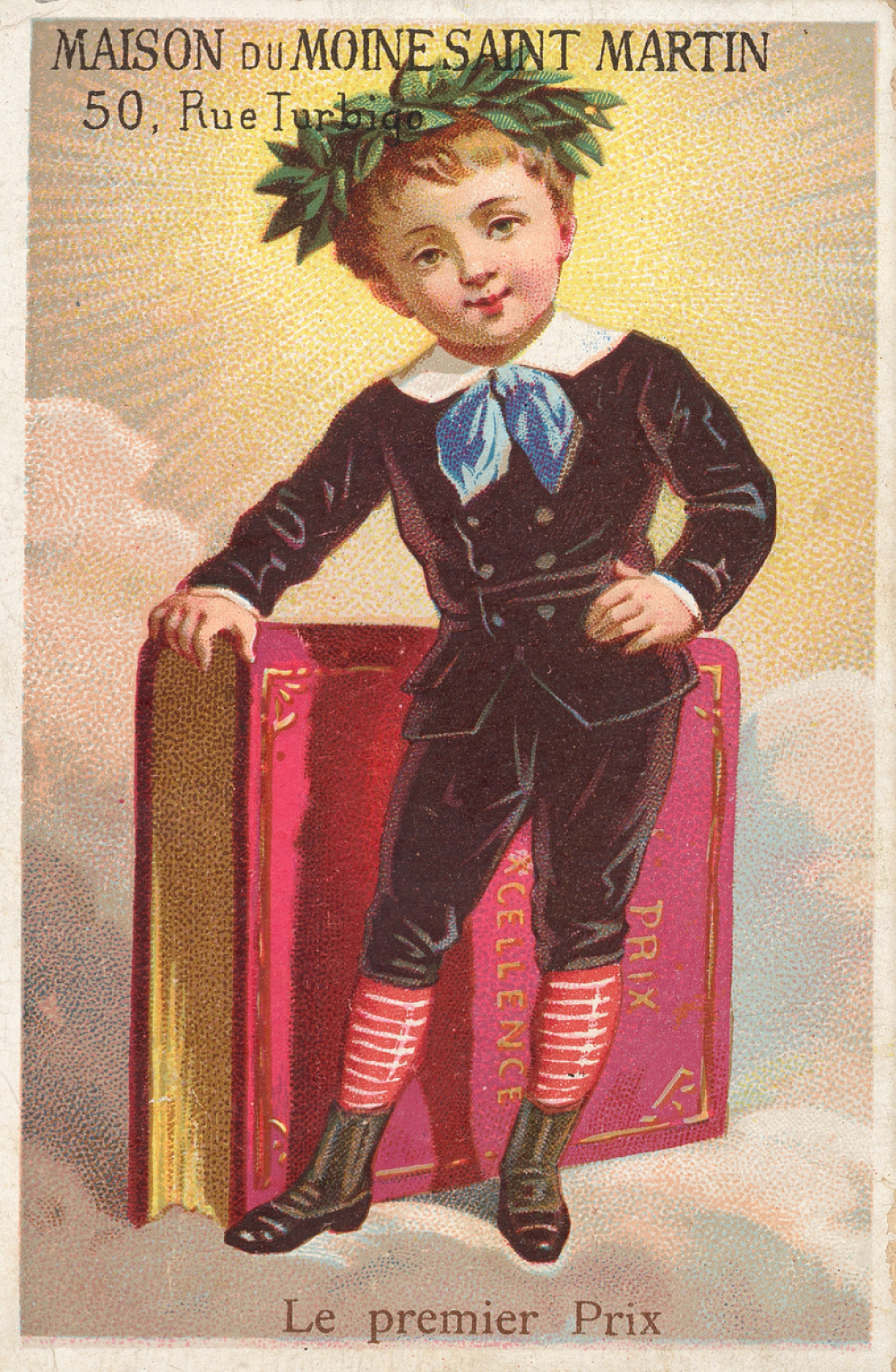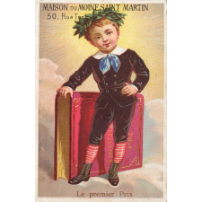 Notes : Scène présentant un enfant récompensé le jour des Prix. En habit, coiffé du bicorne, il porte des livres de prix et une couronne de laurier à son bras g.