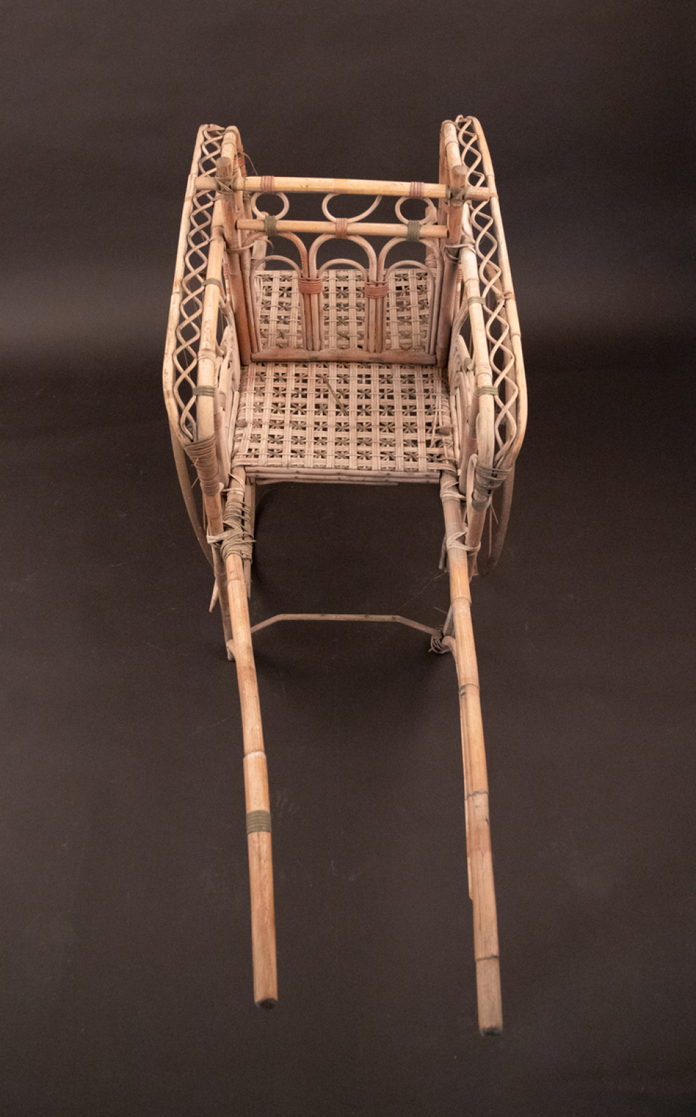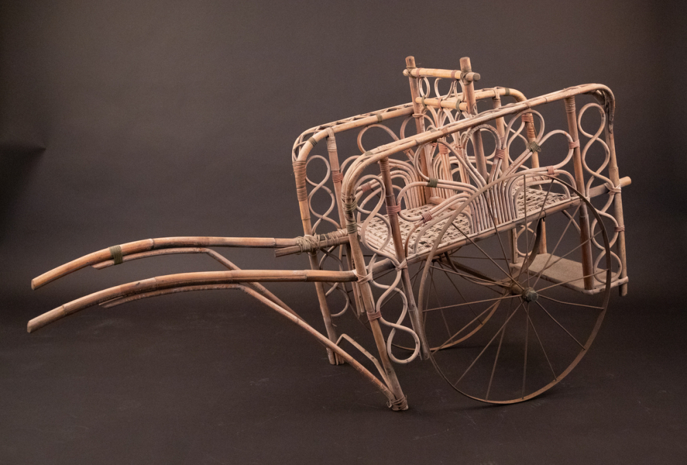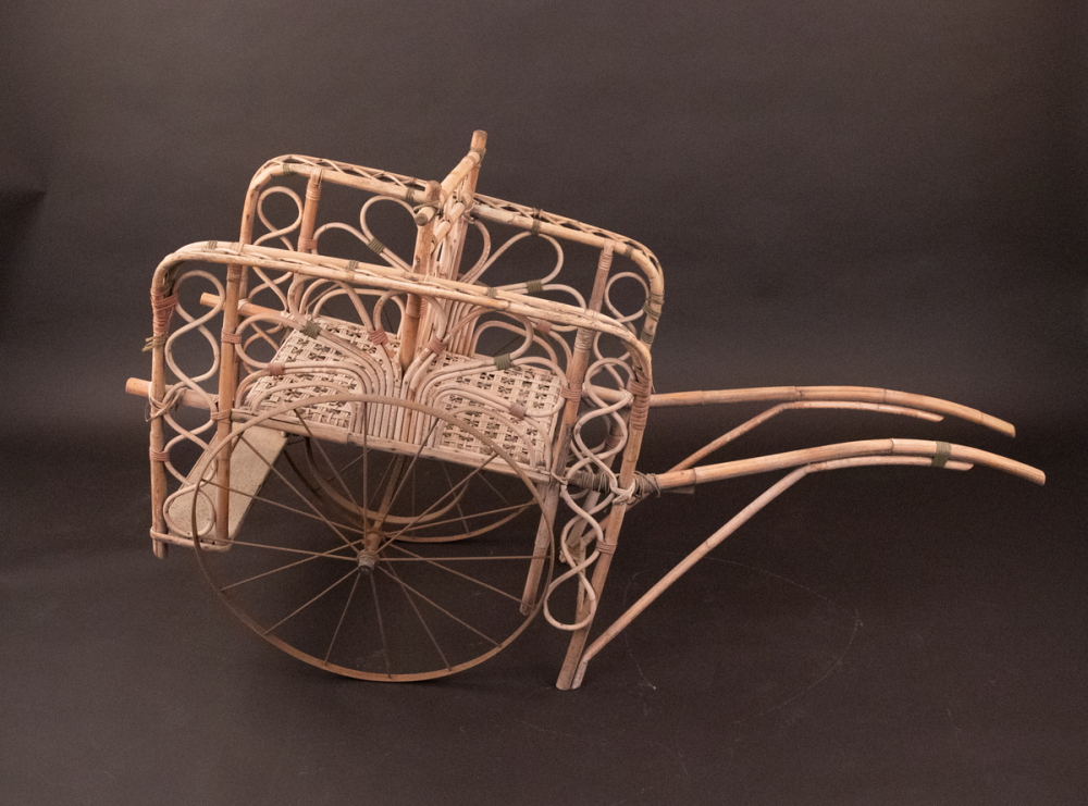 Description : Charrette à bras, deux assises dos à dos un repose pieds d'un côté, deux roues à rayons sur structure métallique fixées sur le châssis de l'assise