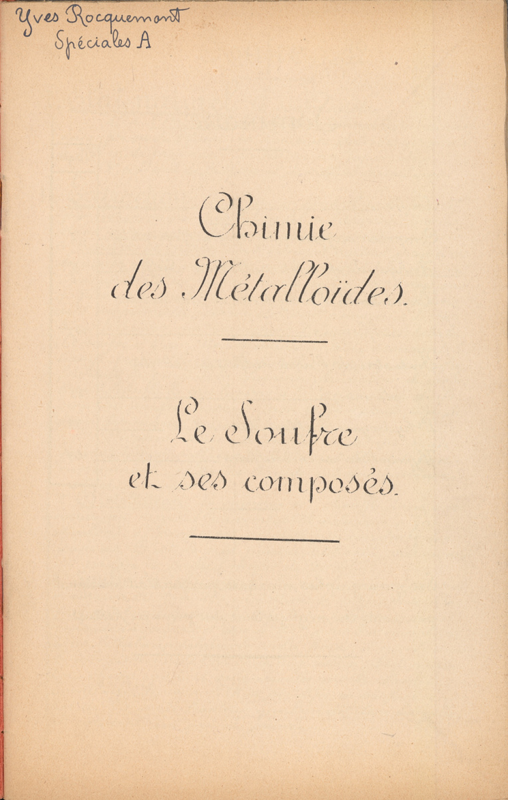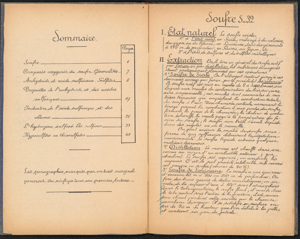 Notes : Il s'agit du cahier de Chimie d'Yves Rocquemont, élève scolarisé en classe préparatoire de l'Ecole Polytechnique en Mathématiques spéciales A dite taupe ("3/2" ou 2e année), au Lycée Saint-Louis de Paris (6e arrondissement), durant l'année 1935-1936.