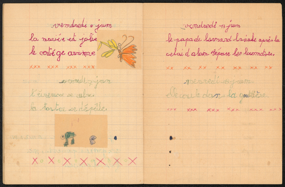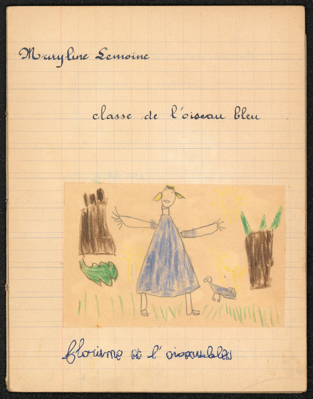 Notes : Il s'agit d'un cahier d'écriture de l'élève Maryline Lemoine, probablement scolarisée en classe de grande section d'une école maternelle de Sartrouville, durant l'année scolaire 1957-1958.