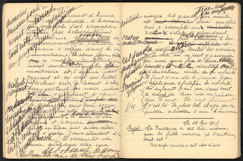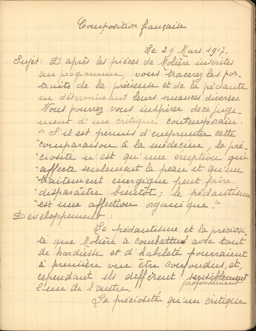 Notes : Il s'agit d'un cahier de Composition française de Marthe Masquelier, scolarisée à l'Institution de jeunes filles de la rue Masséna à Lyon durant l'année 1917, l'élève est alors âgée de 15-16 ans et est probablement en classe de seconde.