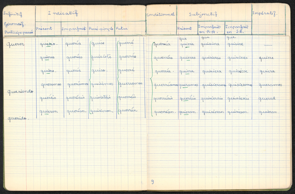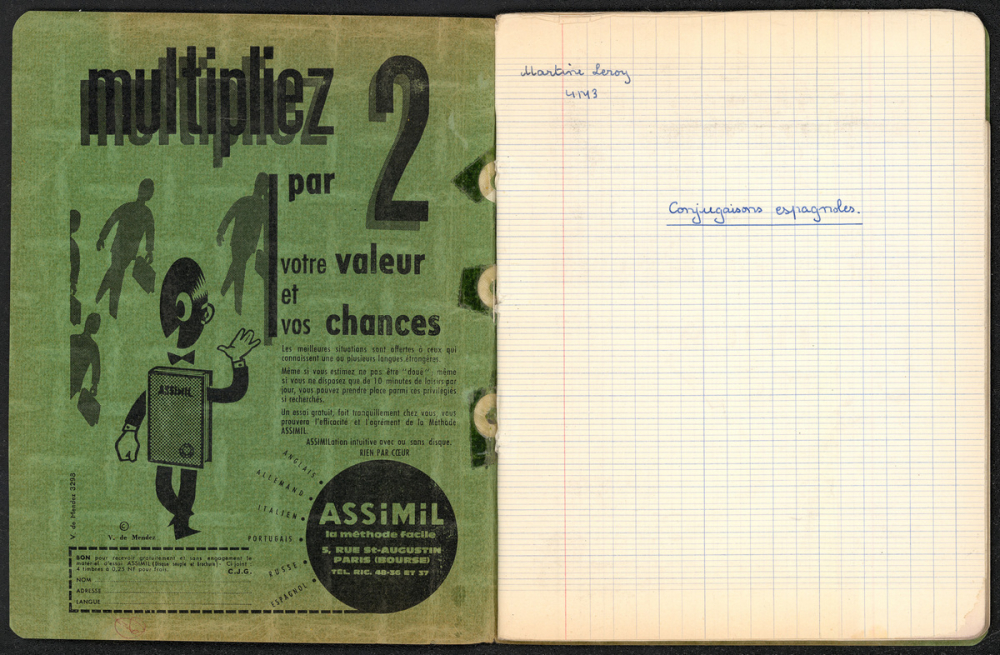 Notes : Cahier d'Espagnol de Martine Leroy-Bouveyron (née Leroy) alors âgée entre 13 et 15 ans, élève de 4e M3 (Moderne) au Lycée Victor Duruy à Paris (VIIe arrondissement), durant l'une des deux années 1960-1961 ou 1961-1962.