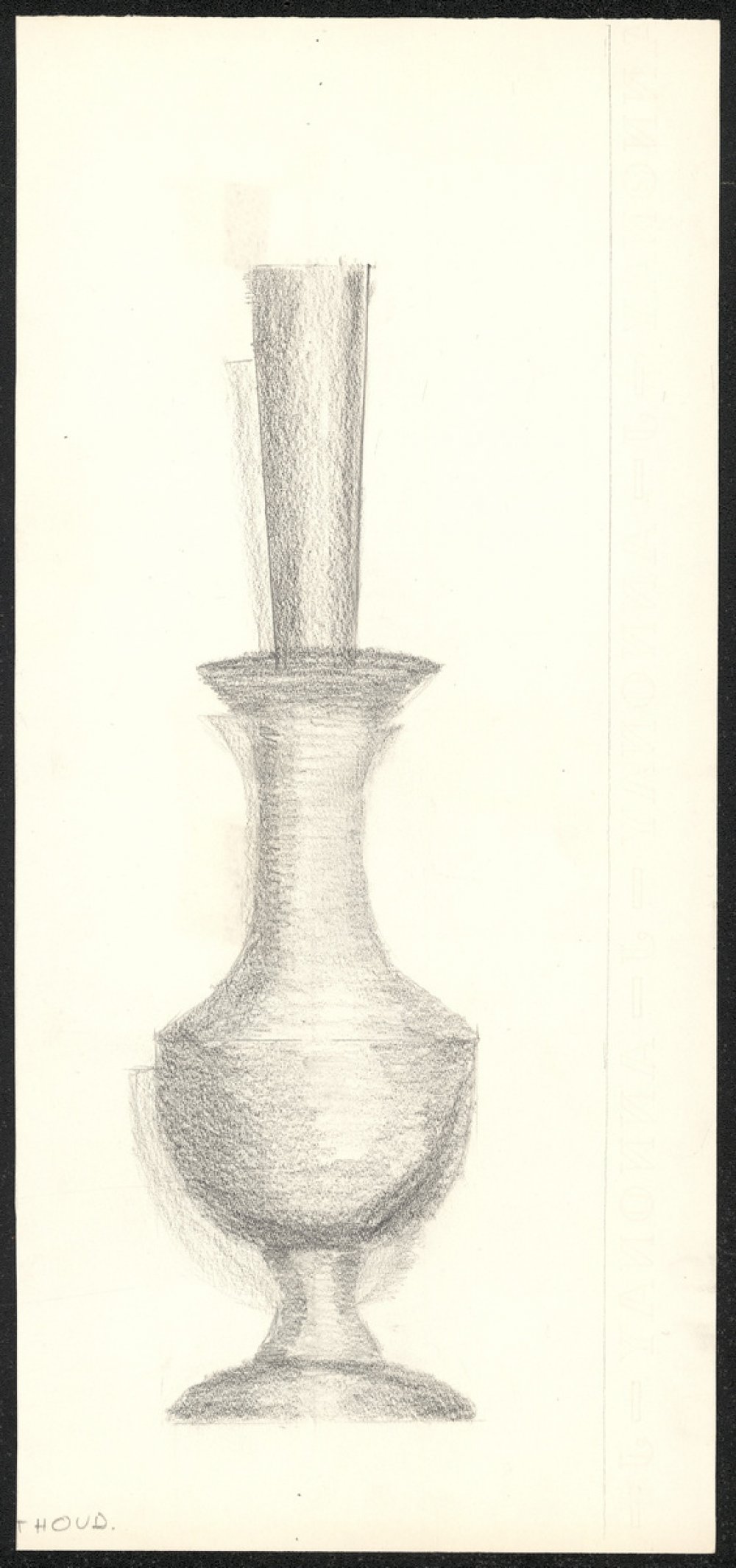 Représentations : vase / Représentation d'un contenant de liquides, très étendu sur la hauteur et dont la largeur varie du bas vers le haut. Le coloriage au crayon à papier permet de donner du relief, ainsi qu'un certain ombrage.