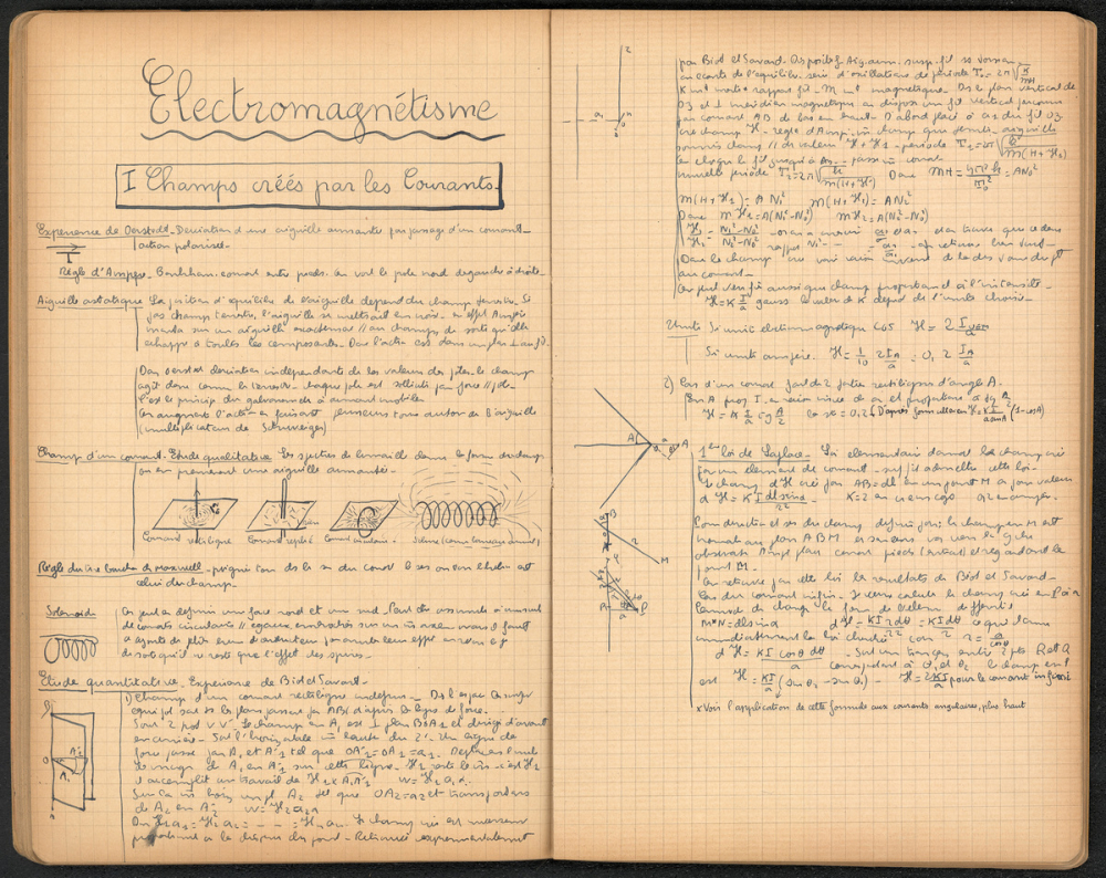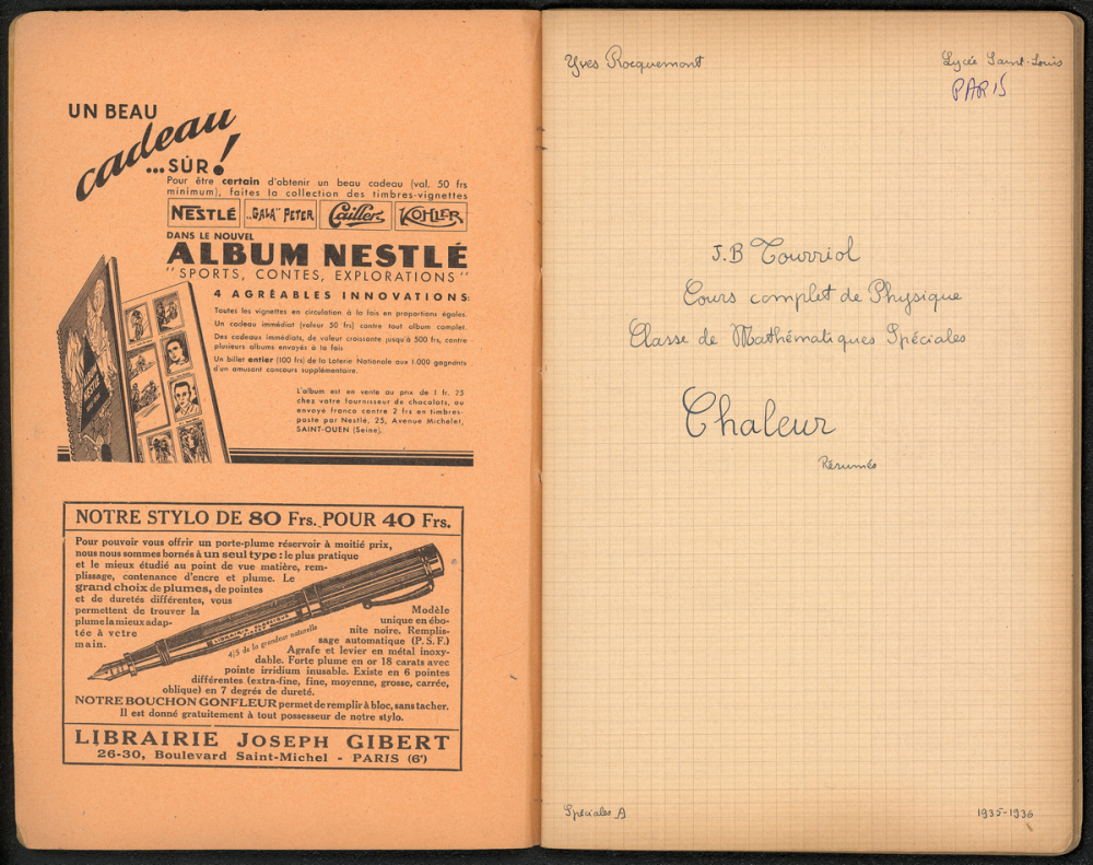 Notes : Il s'agit du cahier de Physique d'Yves Rocquemont, élève scolarisé en classe préparatoire de l'Ecole Polytechnique en Mathématiques spéciales A dite taupe ("3/2" ou 2e année), au Lycée Saint-Louis de Paris (6e arrondissement), durant l'année 1935-1936.