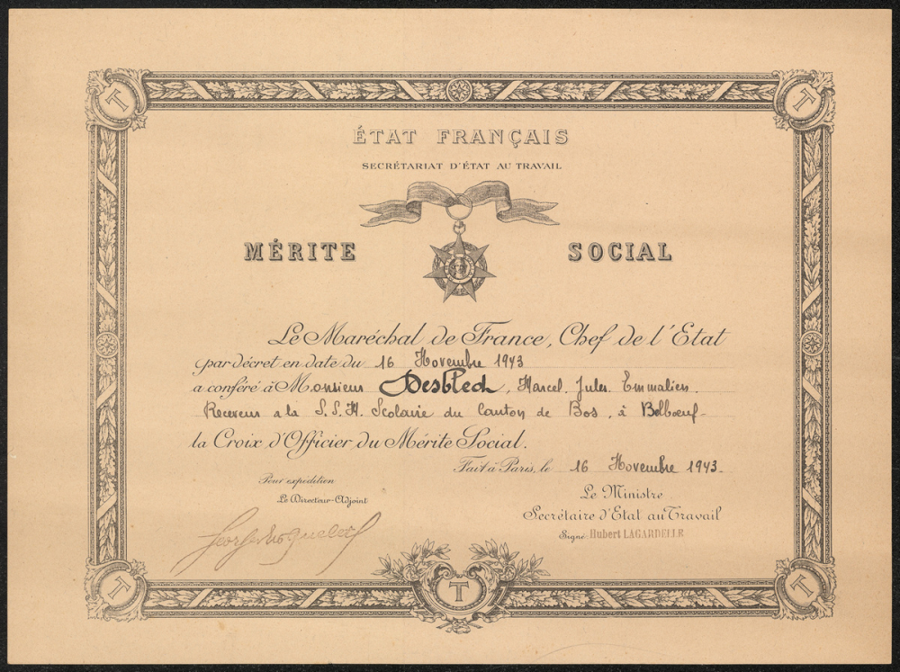 Utilisation / destination : récompense (Diplôme, daté du 16 novembre 1943, conférant la Croix d'Officier du Mérite Social à Monsieur Desbled Marcel Jules Emmalien, receveur à la S.S.M. scolaire du canton de Bos, à Belbeuf. Sur décision du Maréchal de France, Chef de l'État par décret en date du 16 novembre 1943.)