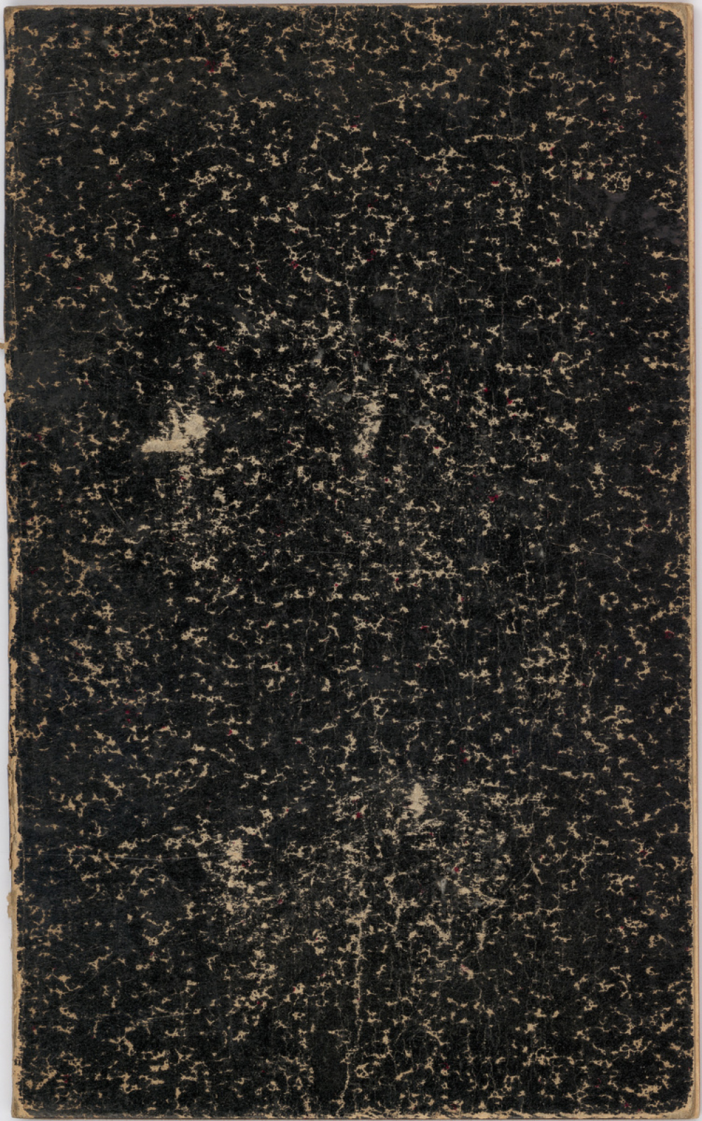 Description : Couverture cartonnée marbrée noire et blanche. Reliure métallique agrafée. Réglure à simple lignage avec cinq marges rouges à gauche et à droite et des interlignes verticales à droite. Page de garde blanche (à la fin). Des pages ont été découpées par l'auteur.