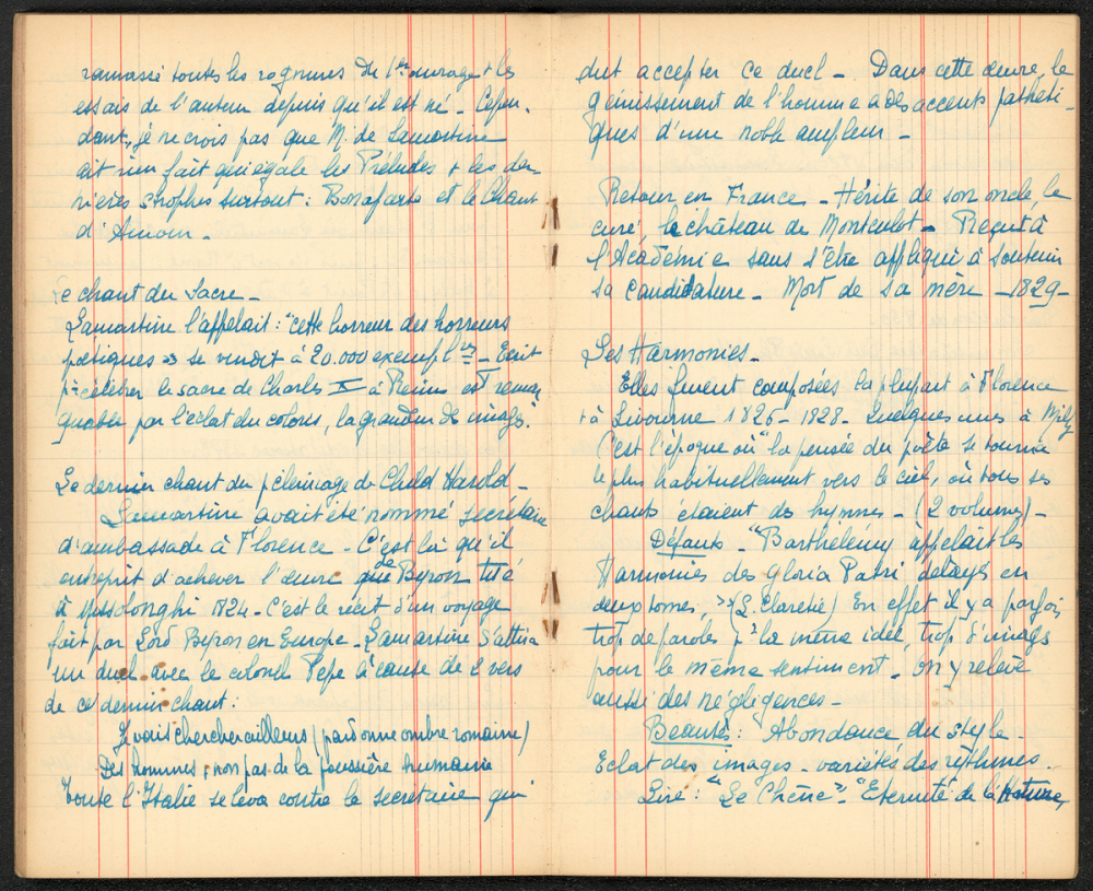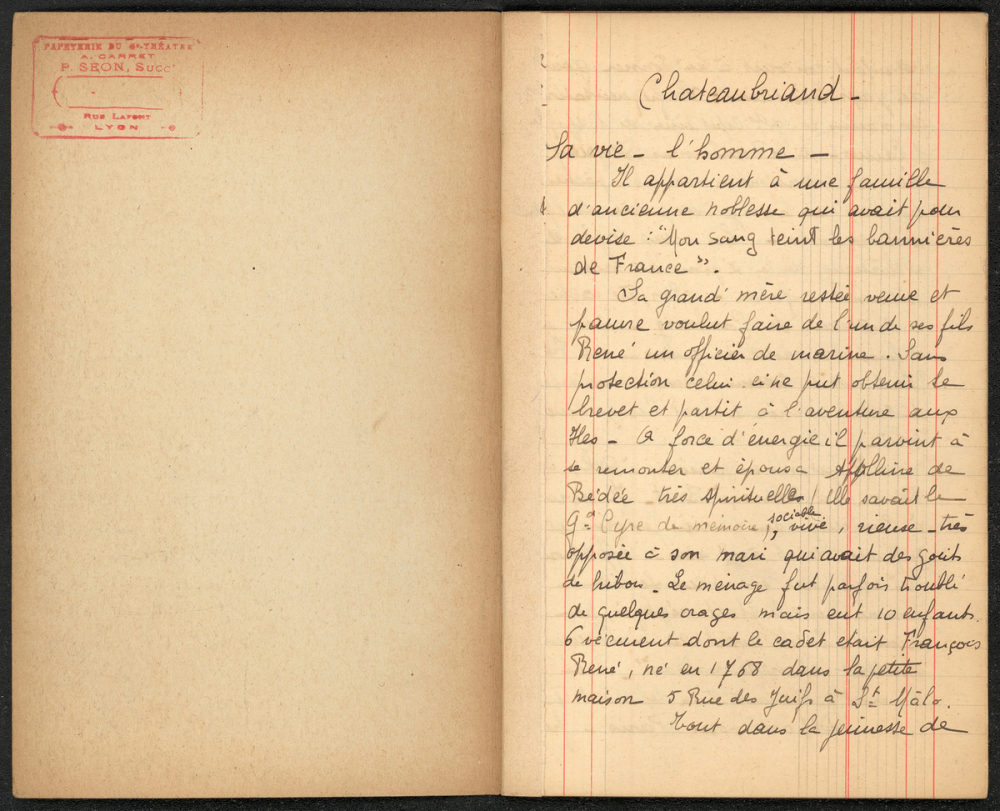 Notes : Il s'agit d'un répertoire de culture littéraire de Marthe Masquelier, scolarisée à l'Institution de jeunes filles de la rue Masséna à Lyon probablement pendant son année de première en 1917-1918, l'élève est alors âgée de 16-17 ans.