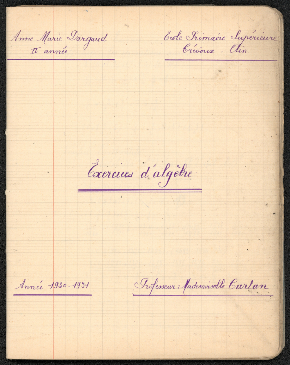 Notes : Cahier d'exercices d'algèbre appartenant à Anne-Marie Dargaud, scolarisée en 2e année à l'Ecole Primaire Supérieure de jeunes Filles de Trévoux (01) pour l'année scolaire 1930-1931.