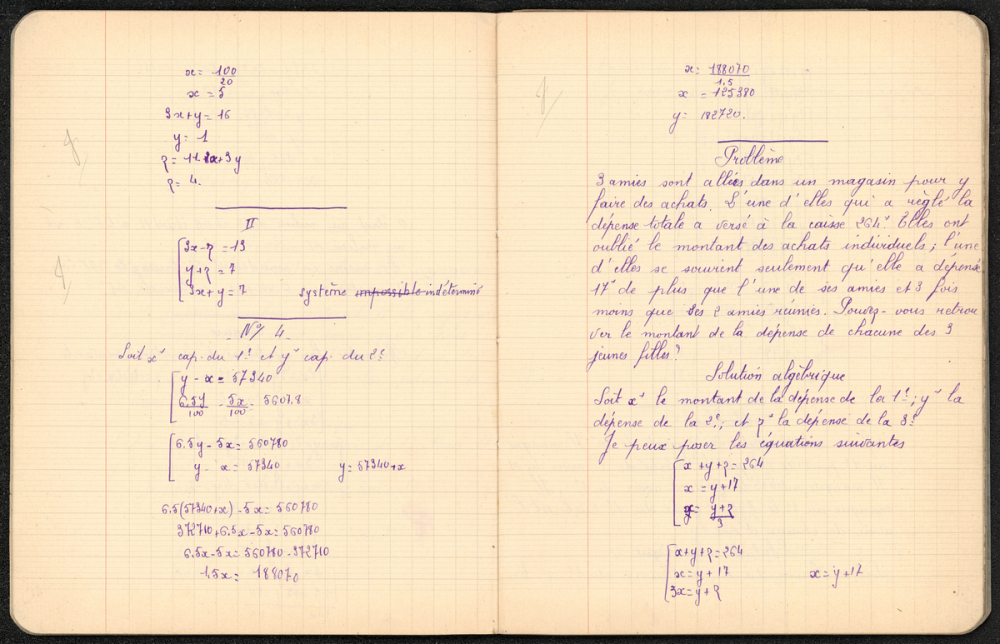 L'ensemble consiste en la résolutions de problèmes engageant des systèmes d'équations. Quelques-uns sont accompagnés d'un graphique réalisé directement sur le cahier ou bien sur une feuille à petits carreaux collée sur une page.