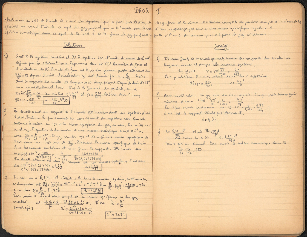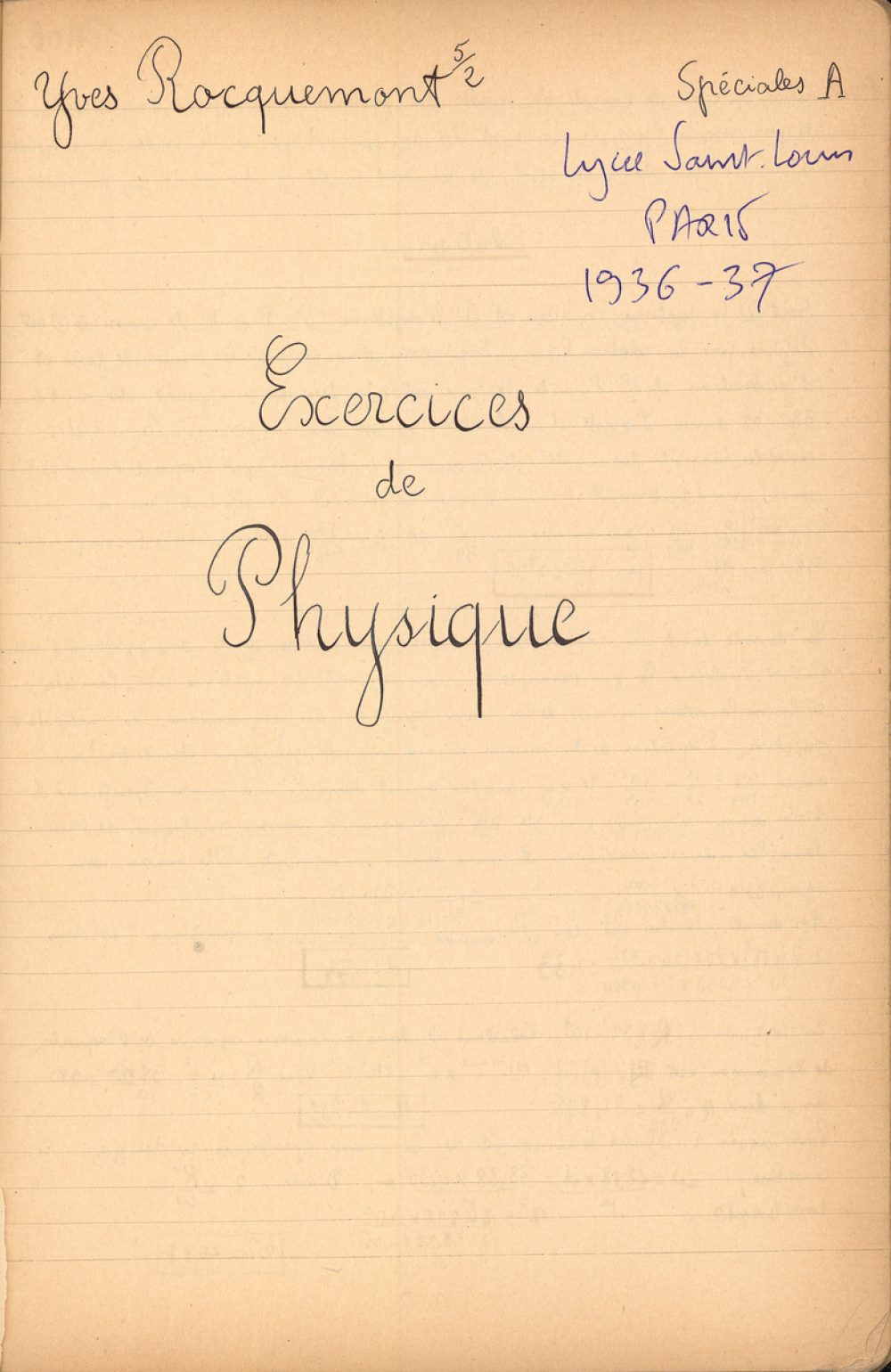 Notes : Il s'agit d'un cahier d'exercices de Physique d'Yves Rocquemont, élève scolarisé en classe préparatoire de l'Ecole Polytechnique en Spéciales A dite taupe (en 5/2, redoublant de 2e année), au Lycée Saint-Louis de Paris (6e arrondissement), durant l'année 1936-1937.