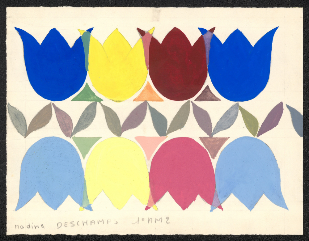 Représentations : tulipe / Huit fleurs de tulipes sont représentées, quatre regardant vers le haut et quatre vers le bas. Au milieu, une ligne de feuilles grises, marrons, vertes, violettes, et bleues, sépare la feuille en deux. De gauche à droite, celles du haut sont bleue, jaune, rouge, et bleue, et celles du bas sont bleue ciel, jaune clair, rose, et bleu ciel. Elles se superposent à leurs extrémités, créant des mélanges de couleurs. La couleur issue du mélange est reproduite sous forme triangulaire en-dessous ou au-dessus des fleurs correspondantes.