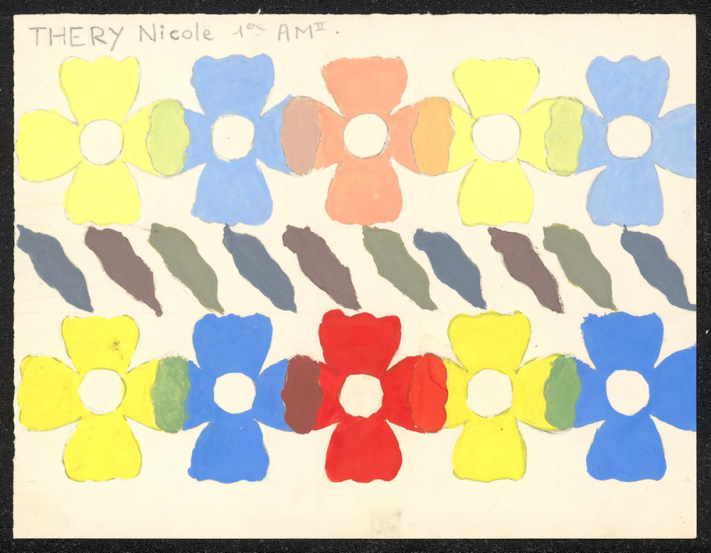 Historique : Ce dessin appartient à une série de travaux d'élèves conservés à l'origine par la professeure d'éducation artistique de l'École technique puis Lycée technique Jeanne d'Arc, à Sainte-Adresse (76), réalisés entre 1958 et 1985. Il faisait partie d'un lot intitulé : toutes sections couleur 1ers exercices.