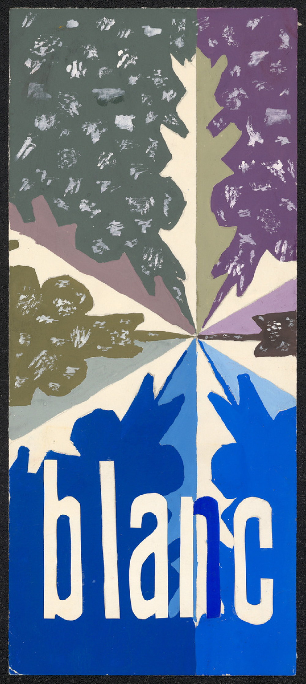 Représentations : neige / Un flocon de neige à six branches coupe la feuille en plusieurs parties, qui sont peintes de différentes couleurs, à savoir (dans le sens des aiguilles d'une montre en commençant en haut à droite) violet, marron, bleu, bleu marine, vert kaki, et gris. Toutes les couleurs sauf le bleu et le bleu marine sont remplies de petites traces de peintures blanches disséminées sur la surface de la feuille. Les branches du flocon sont coupées en deux dans le sens de la longueur, une partie étant blanche (par l'absence de peinture), et l'autre peinte de différentes couleurs, à savoir (dans le sens des aiguilles d'une montre en commençant par le haut) vert kaki, mauve, bleu ciel, bleu, gris, violet. En bas de la feuille, le mot "blanc" est écrit par des lettres découpées et collées sur la feuille. Elles sont blanches, sauf la partie droite du "n" qui est bleu marine car il est collé sur la partie blanche de la branche du flocon.
