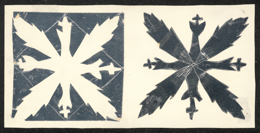 Représentations : neige / Représentation de deux flocons de neige, celui de gauche étant blanc sur fond argenté, et celui de droite argenté sur fond blanc. Les flocons sont à peu près identiques, ayant chacun huit branches, quatre d'une forme et quatre d'une autre.