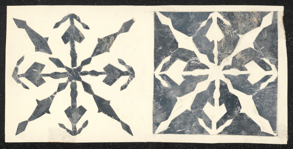 Représentations : neige / Représentation de deux flocons de neige, celui de droite étant blanc sur fond argenté, et celui de gauche argenté sur fond blanc. Les flocons sont à peu près identiques, ayant chacun huit branches, quatre d'une forme et quatre d'une autre.