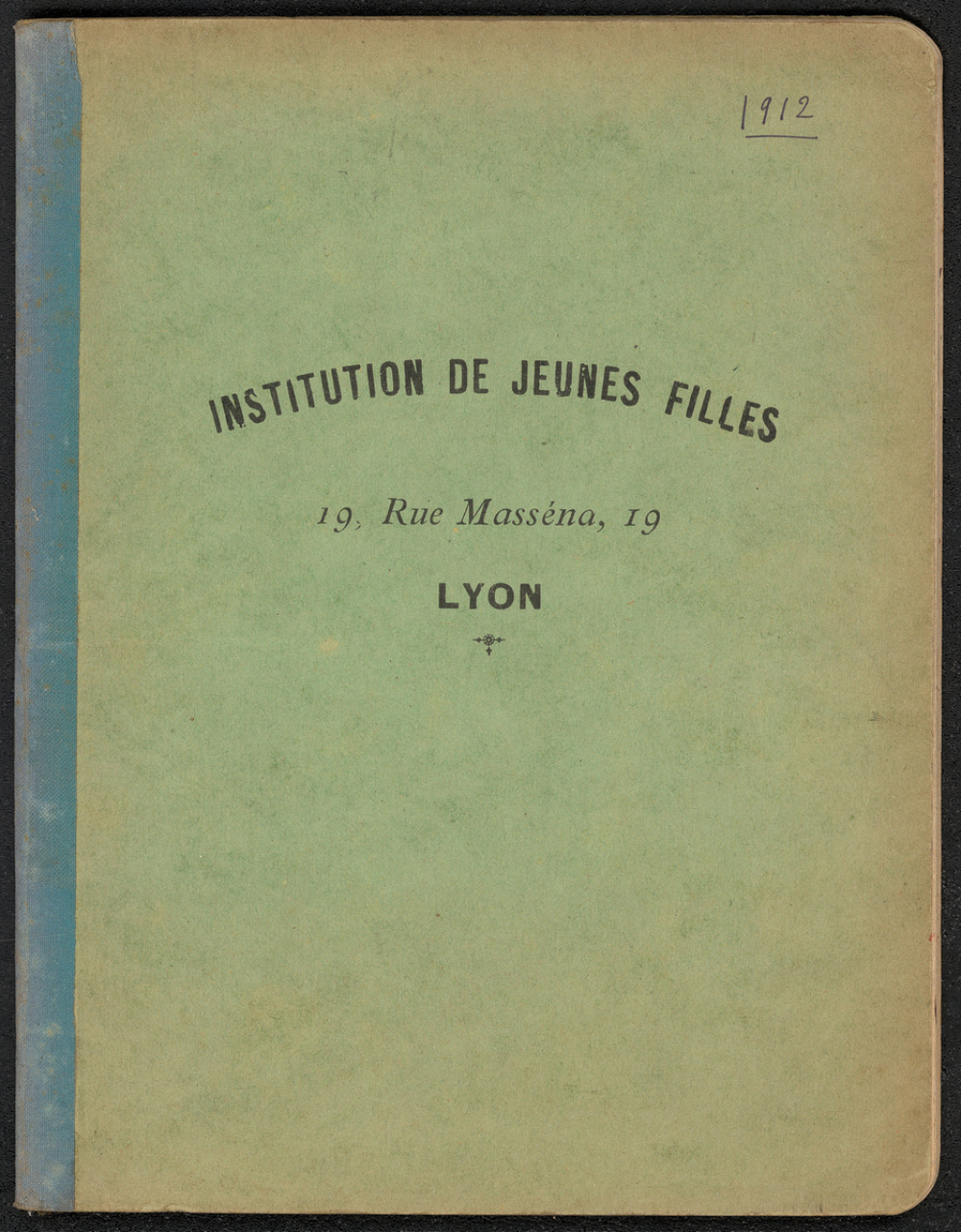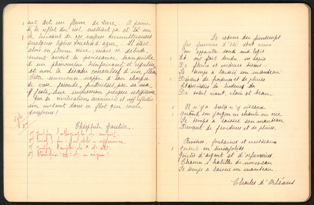 Notes : Il s'agit d'un cahier de français de Marthe Masquelier, scolarisée à l'Institution de jeunes filles de la rue Masséna à Lyon durant l'année 1912-1913, l'élève est alors âgée de 11-12 ans et est probablement en classe de 7e (CM2).