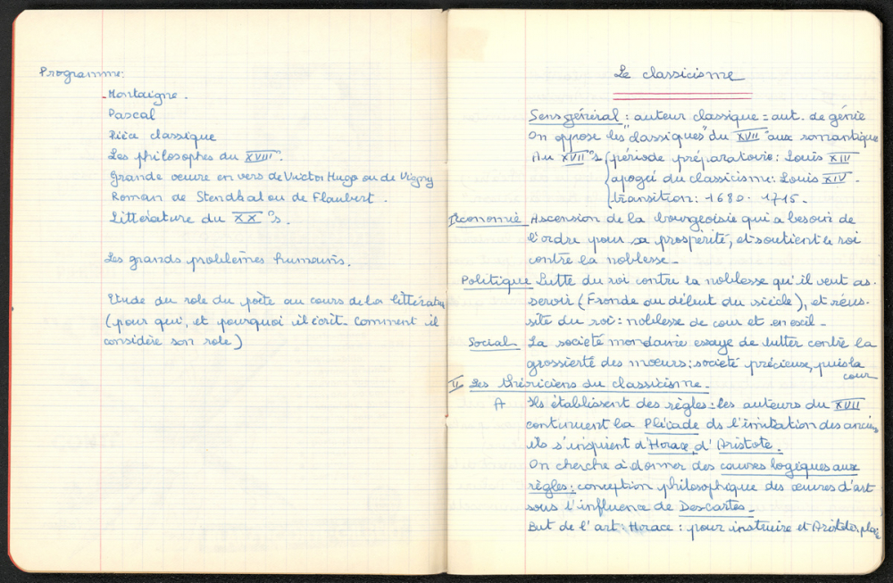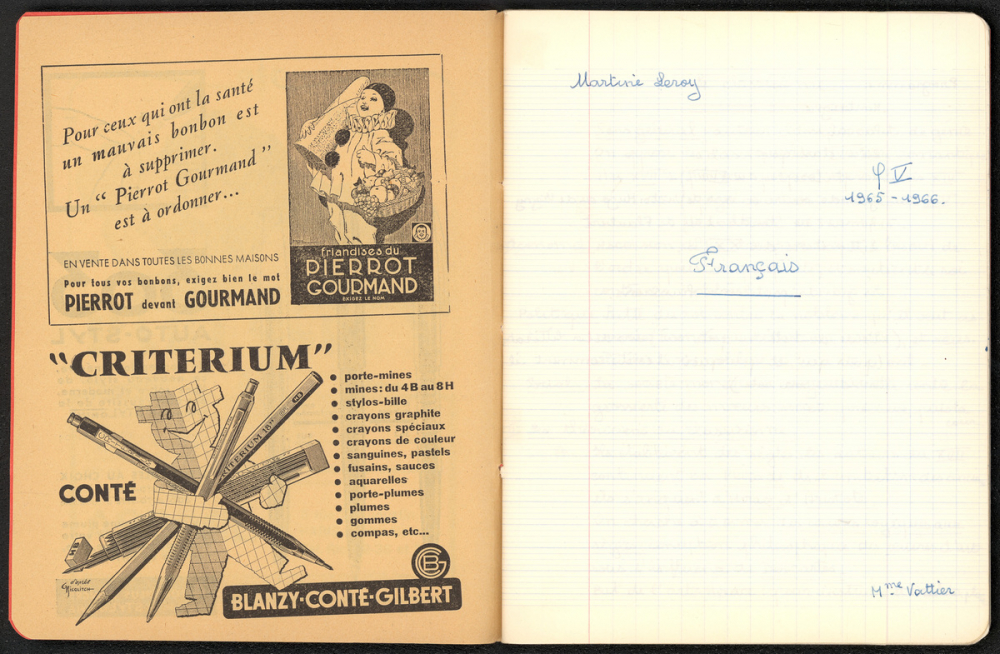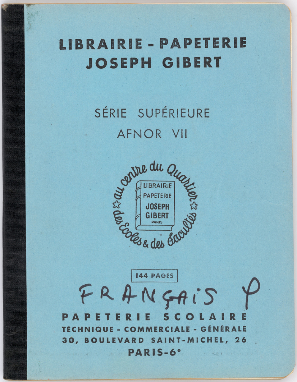 Notes : Il s'agit du cahier de Français de Martine Leroy-Bouveyron (née Leroy) alors âgée de 18 ans, élève de Madame Vattier en Terminale Philosophie V au Lycée Victor Duruy à Paris (VIIe arrondissement), durant l'année 1965-1966.