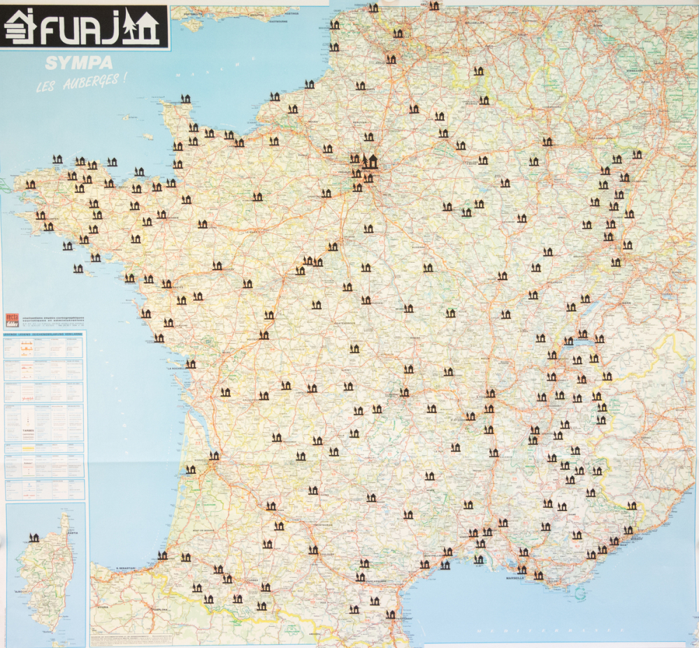Représentations : carte géographique, tourisme, auberge / Carte routière et touristique de la France, sur laquelle sont indiquées, par un logo noir, les auberges de jeunesse affiliées à la FUAJ (Fédération Unie des Auberges de Jeunesse). A gauche, la Corse est représentée dans un carton, ainsi qu'une légende.