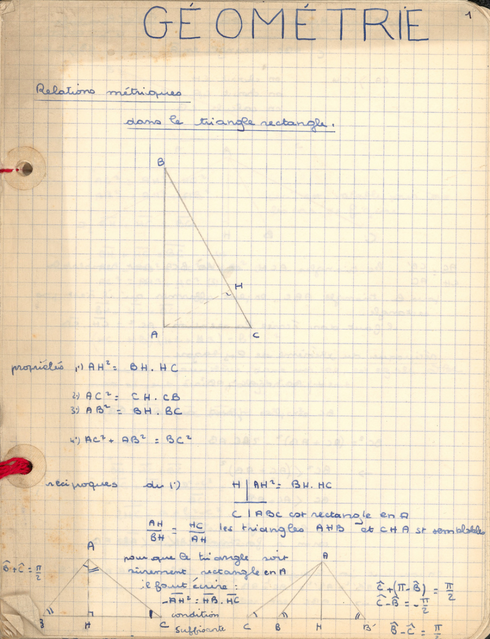 Notes : Il s'agit du cahier de Géométrie de Marie-France Rocquemont (épouse Morel), élève alors scolarisée au lycée Marie Curie de Sceaux (Hauts de Seine, ex-Seine) en classe de Terminale série Mathématiques élémentaires, durant l'année 1958-1959.