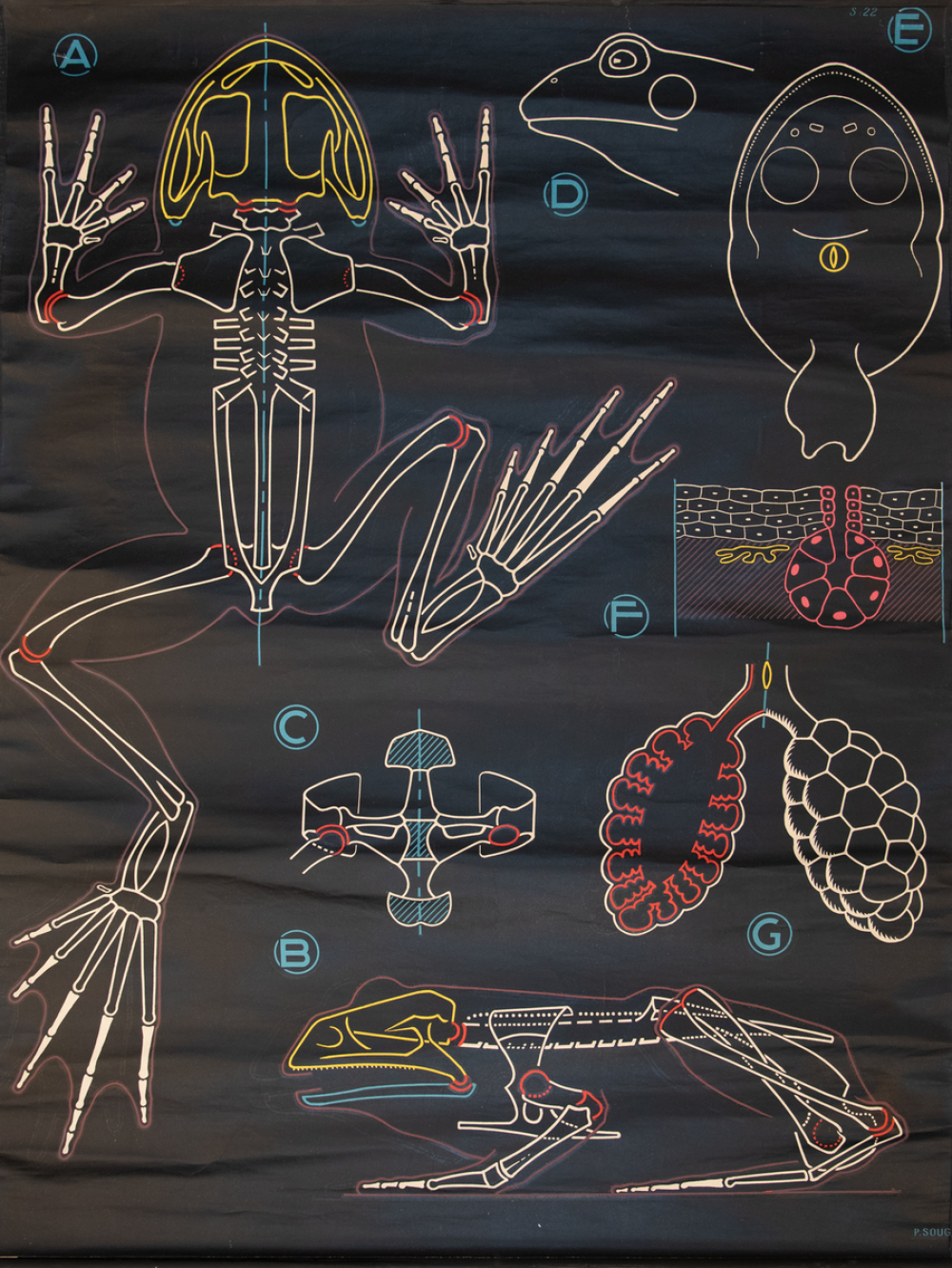 Description : Grande planche murale de sciences naturelles illustrée en couleurs sur fond noir, imprimée sur papier glacé épais avec baguettes en bois en haut et en bas de la planche munie d'un ruban de suspension et entoilée au dos.