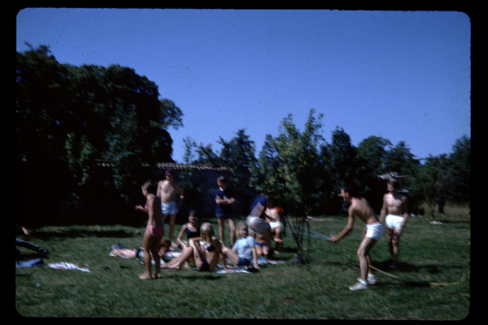 Représentations : scènes : être humain / Un groupe de personnes se tient dehors, dont un homme torse nu portant un short blanc et tenant un tuyau d'arrosage. Certaines personnes sont assises.