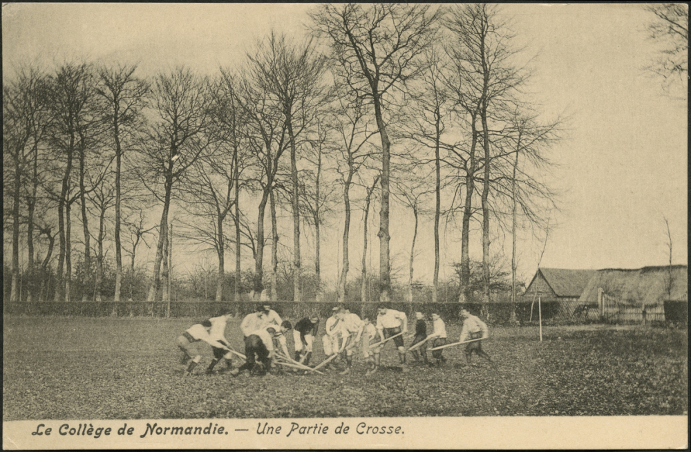 Notes : Photographie représentant plusieurs jeunes garçons jouant à une partie de crosse dans le parc du Collège de Normandie à Mont-Cauvaire.