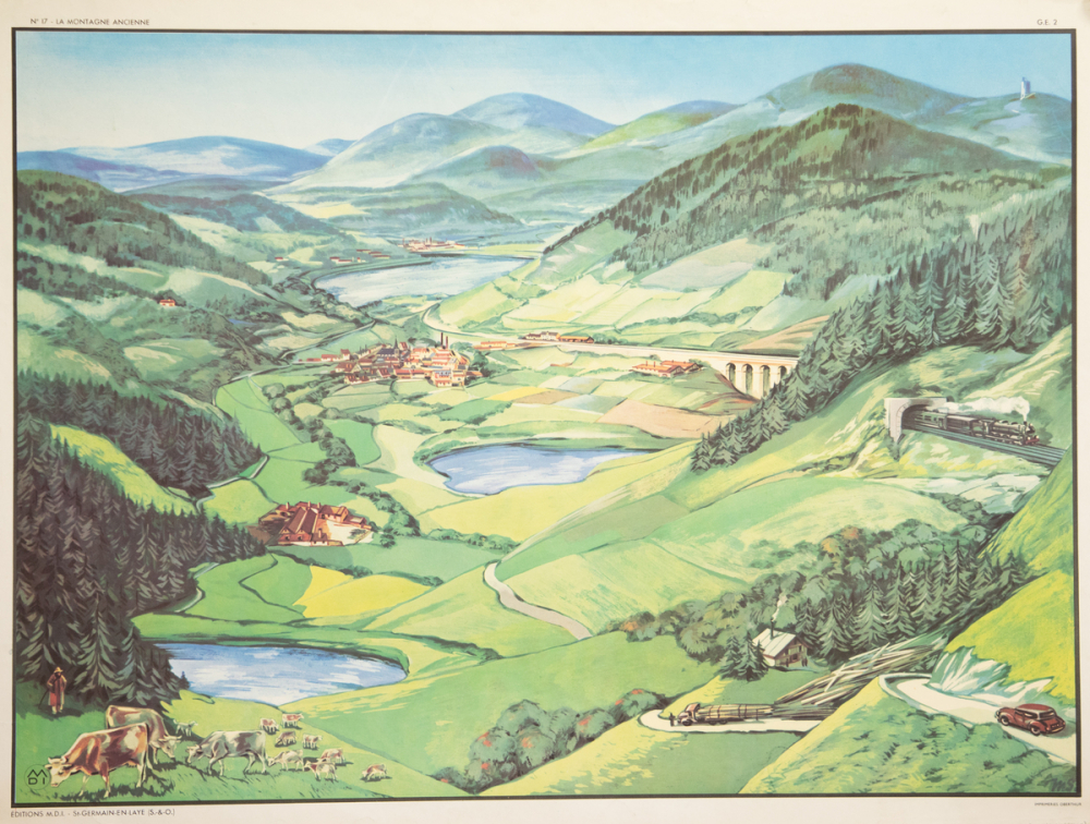 Verso : vue d'un paysage de montagne ancienne, avec au premier plan une usine et deux plans d'eau, au deuxième plan un village et un viaduc, à l'arrière plan des sommets. Des animaux d'élevages sont représentés, quelques activités agricoles et des routes sur lesquelles circulent plusieurs véhicules, une voie ferrée avec un train à vapeur sortant d'un tunnel.