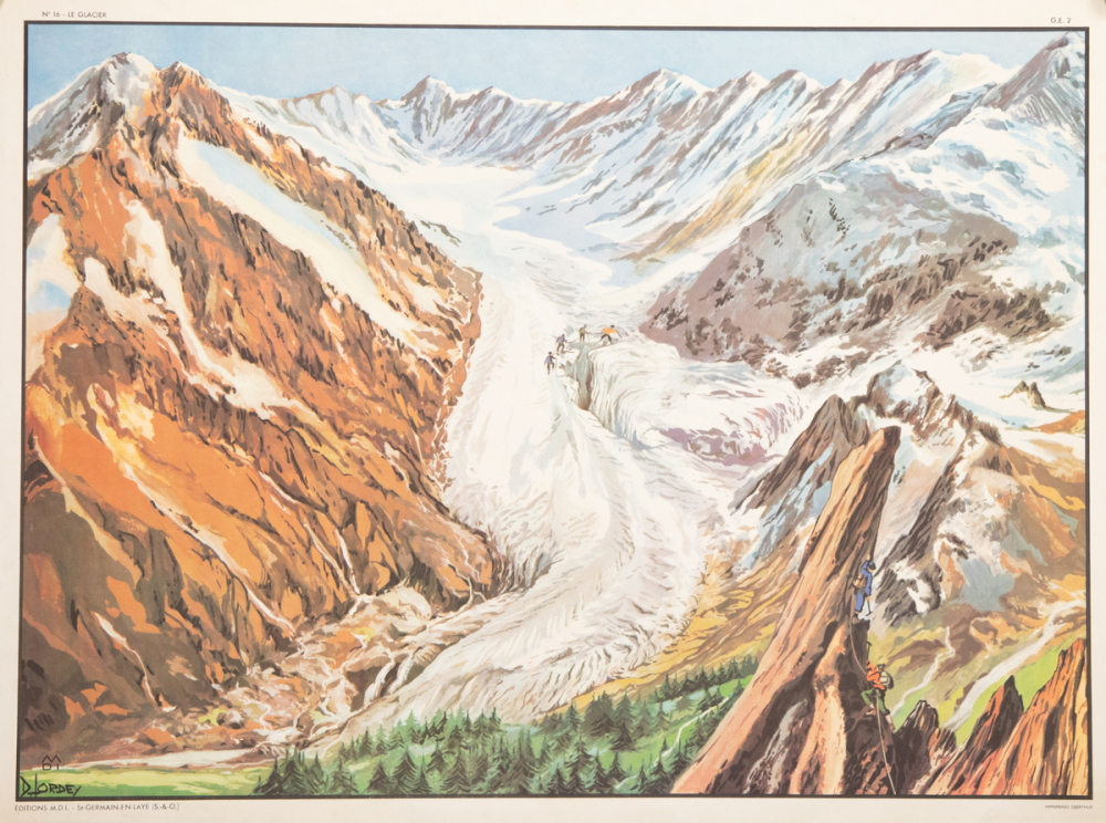 Représentations : glacier, montagne, montagne / Recto : vue d'un paysage de glacier. Au premier plan, deux alpinistes en train d'escalader un piton rocheux ; au deuxième plan, une cordée de quatre alpinistes en train de gravir le glacier.