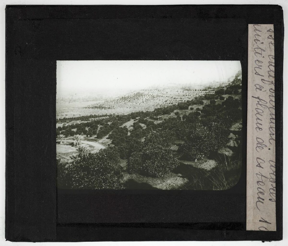 Les Produits du sol de la Californie. Arbres fruitiers à flanc de coteau.
