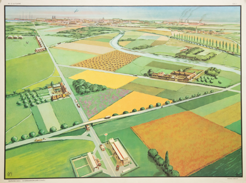 Verso : vue en plongée d'un paysage de plaine, composé en grande partie de champs et prés, traversés de routes et d'une rivière doublée d'un canal. Au premier plan, une station essence. A l'arrière plan, on aperçoit une ville et une zone industrialo-portuaire.