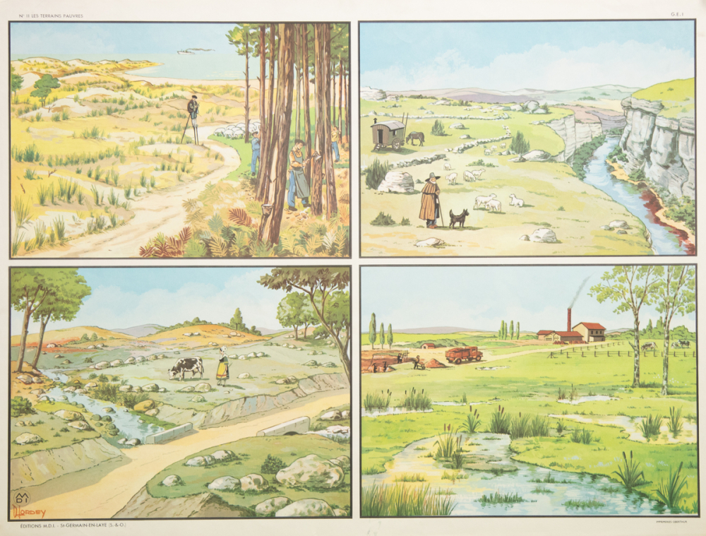 Représentations : plaine, cour de ferme, champ / Recto : quatre vues de paysages ruraux peu productifs caractéristiques des régions françaises. En haut à gauche, paysage littoral de type landais, avec dunes et pinède, et élevage ovin. En haut à droite, paysage typique de causse (plateau calcaire avec canyon, élevage ovin). En bas à gauche, paysage de petites collines rocailleuses qui pourrait ressembler à l'intérieur de la Bretagne ou de la Normandie. En bas à droite, un paysage de zone humide, peu vallonné, avec une activité industrielle visible (briqueterie?) et des personnes extrayant de la terre ou de la tourbe.