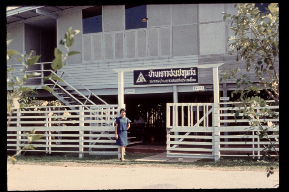 Représentations : vue d'architecture : auberge / Le portail de l'auberge est visible, avec le bâtiment en arrière-plan. Une enseigne en écriture thaïe est placée au-dessus du portail. À l'avant, une femme pose devant l'entrée.