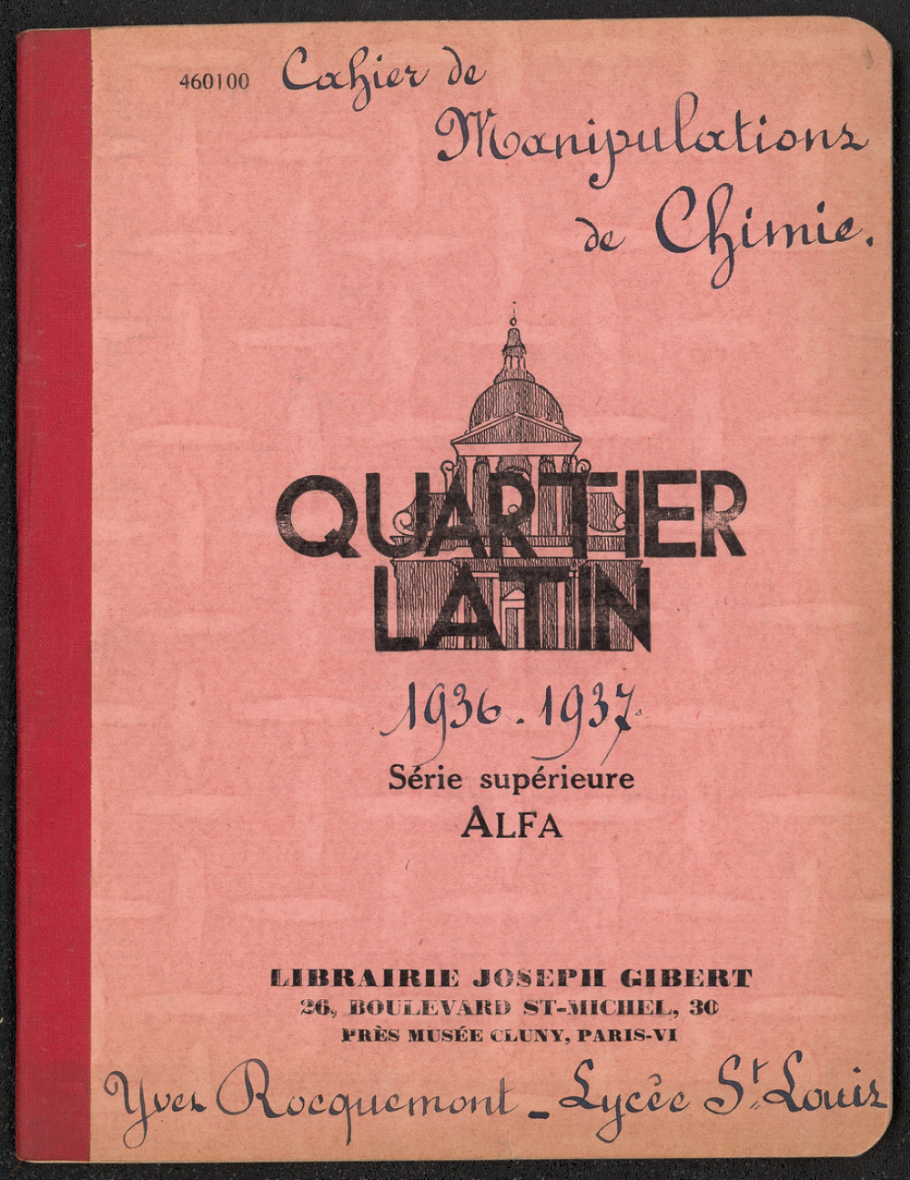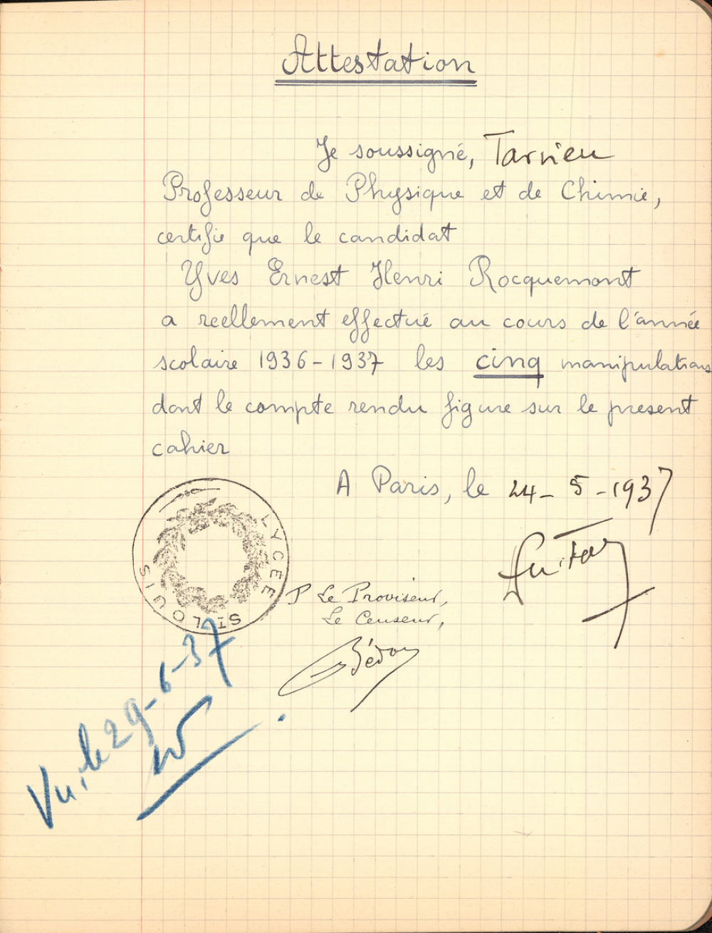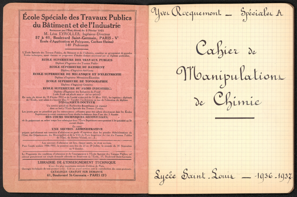 Notes : Il s'agit du cahier de Manipulations de Chimie d'Yves Rocquemont, élève scolarisé en classe préparatoire de l'Ecole Polytechnique en Spéciales A dite taupe (en 5/2, redoublant de 2e année), au Lycée Saint-Louis de Paris (6e arrondissement), durant l'année 1936-1937.
