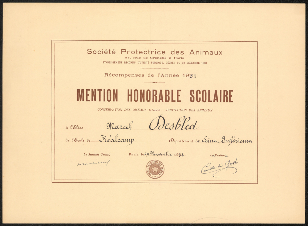 Historique : Décerné par la Société Protectrice des Animaux, ce diplôme de « Mention honorable scolaire » récompensait les élèves s'étant distingués par leur conduite exemplaire envers les animaux et leur intérêt pour la nature. Il visait à encourager la bienveillance, la sensibilité morale et la protection des espèces utiles, notamment les oiseaux. Il illustre l'action éducative de la SPA au sein des écoles françaises pour promouvoir compassion, civisme et respect du vivant.