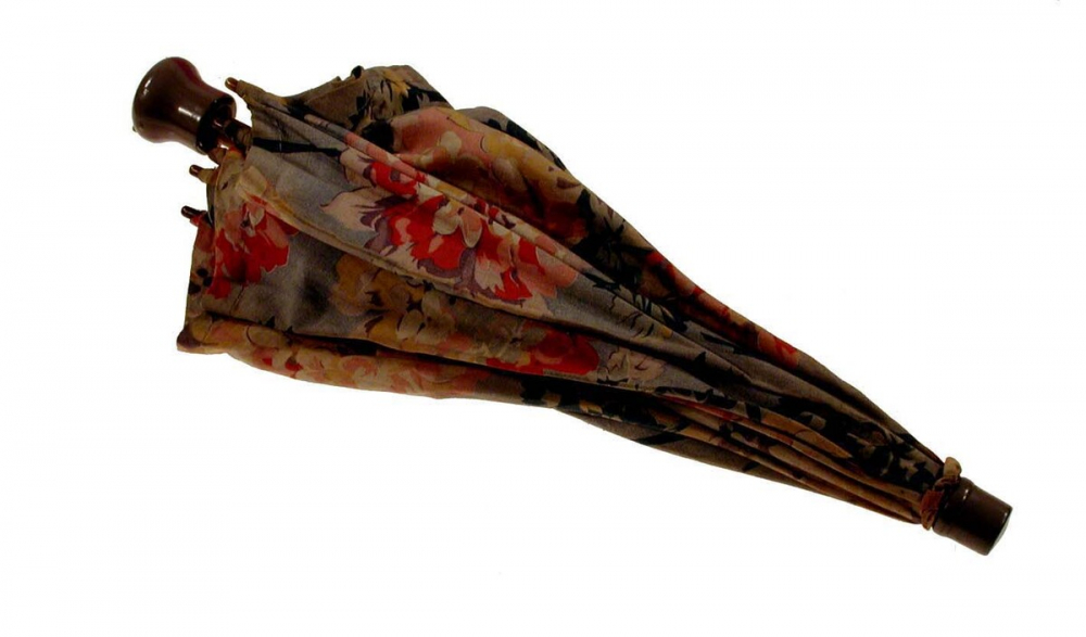 Description : Ombrelle imprimée fleurie, système d'ouverture et de fermeture métallique, manche en bois verni, poignée plastique grise