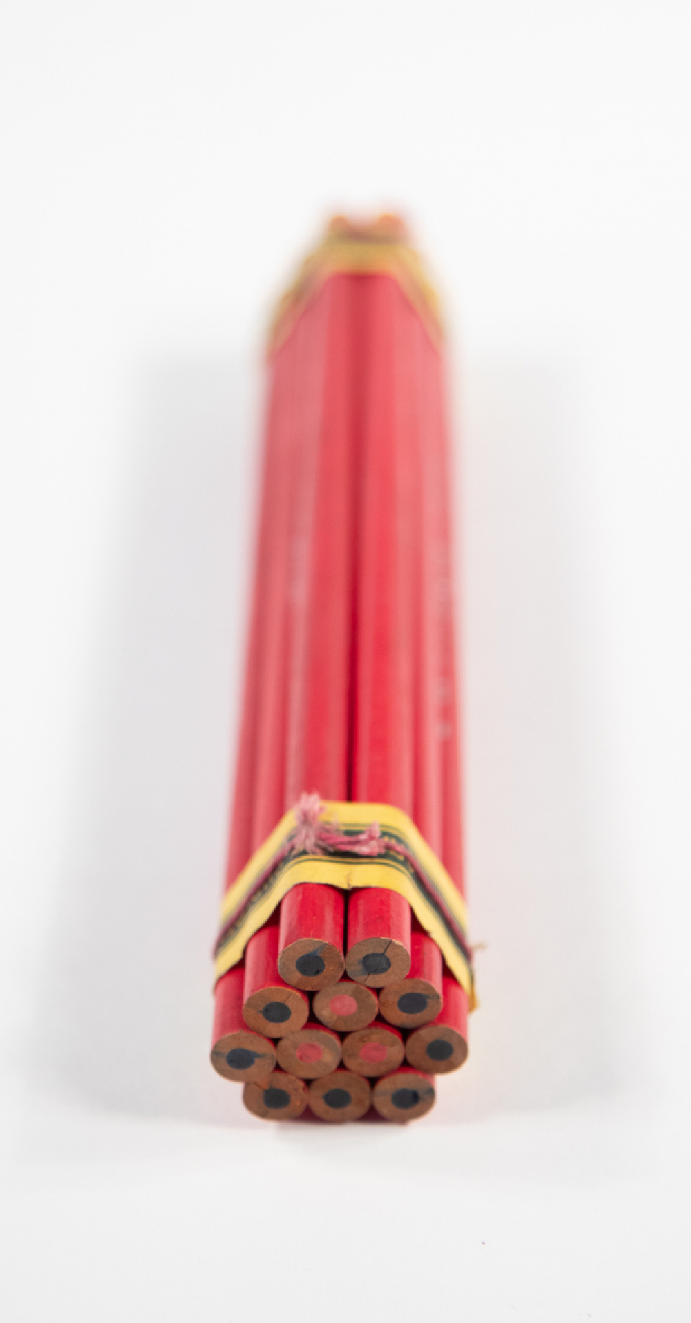 Description : Ensemble de 12 crayons en bois, identiques, non-taillés, groupés entre-eux par une bande de papier aux deux extrémités.