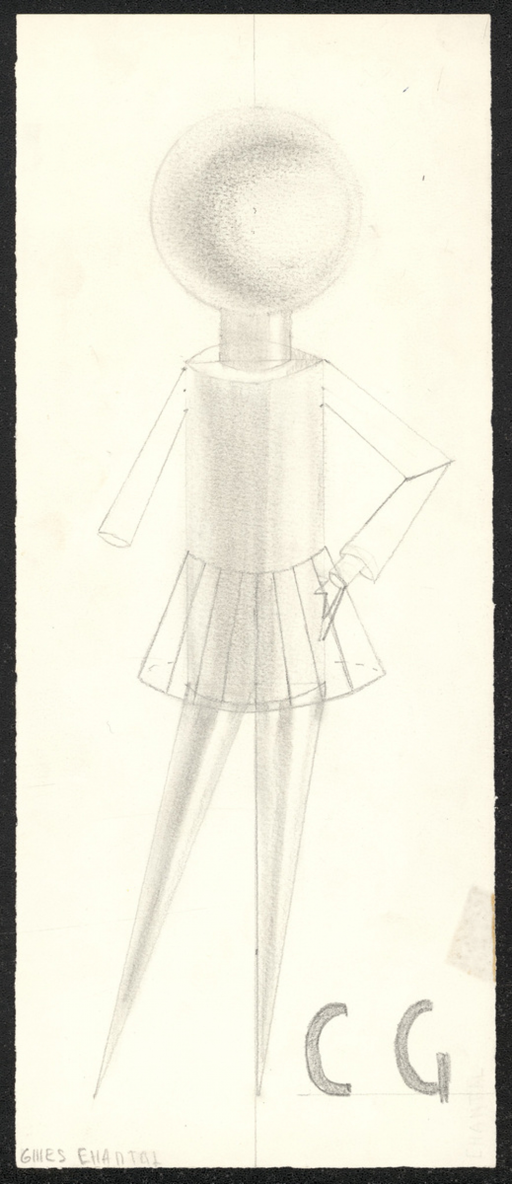 Représentations : femme imaginaire / Représentation d'une femme sous la forme de figures géométriques en trois dimensions : un cylindre pour le tronc, des cônes pour les jambes, une sphère pour la tête, entre autres. Le tout est colorié partiellement au crayon à papier pour donner du relief. Le tronc est entourée d'une jupe figurée en simples lignes de crayon et transparente. À droite du personnage sont écrites en gros les lettres "CG" correspondant aux initiales de l'élève.