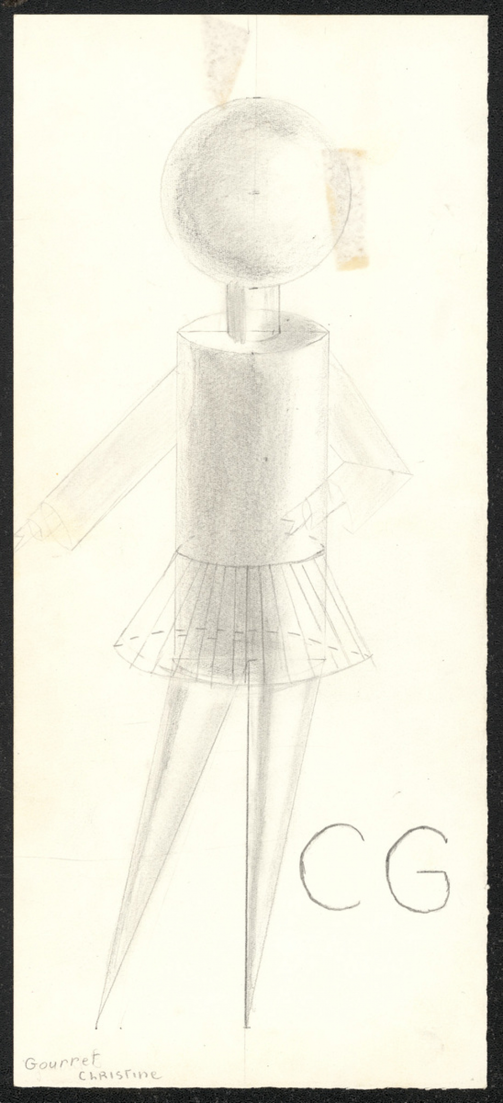 Représentations : femme imaginaire / Représentation d'une femme sous la forme de figures géométriques en trois dimensions : un cylindre pour le tronc, des cônes pour les jambes, une sphère pour la tête, entre autres. Le tout est colorié partiellement au crayon à papier pour donner du relief. Le tronc est entourée d'une jupe figurée en simples lignes de crayon et transparente. À droite du personnage sont écrites en gros les lettres "CG" correspondant aux initiales de l'élève.