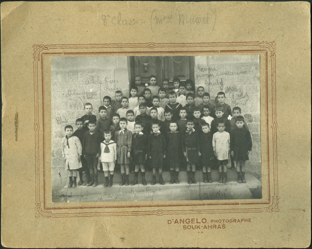 Historique : Photographie de classe prise vers 1930 en Algérie à Souk-Ahras, ville située à 75 kilomètres au sud-est de Guelma et à 100 kilomètres au sud-est d'Annaba.