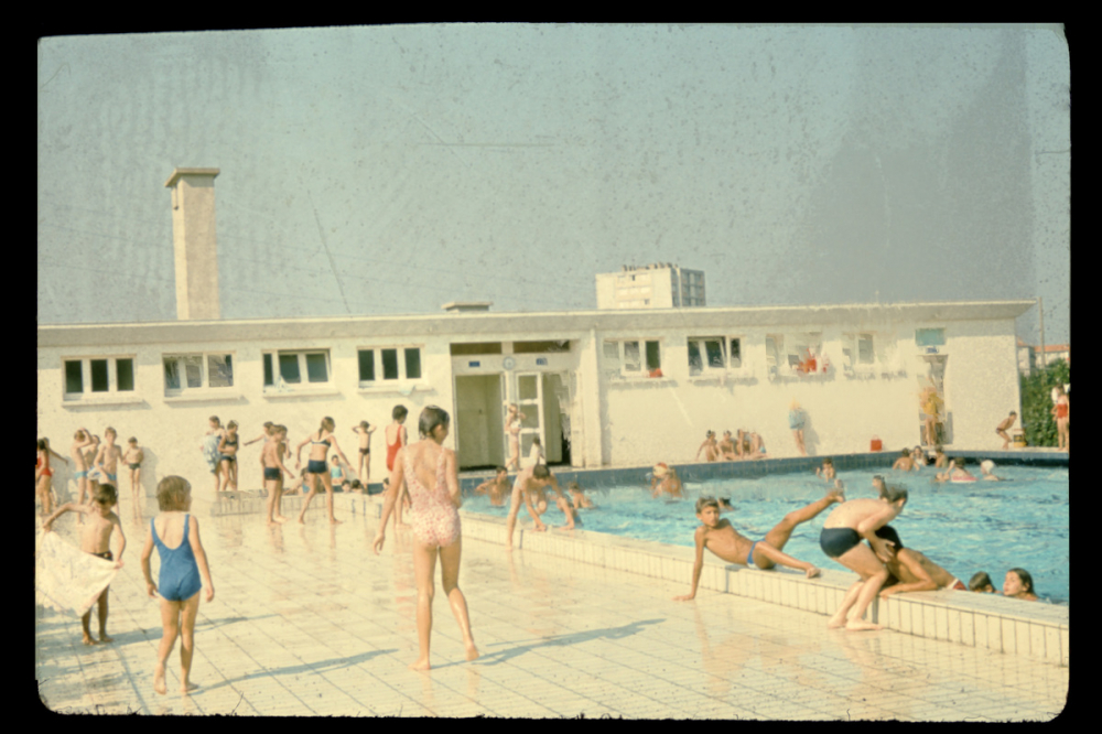 Représentations : vue d'architecture : auberge / Des enfants sont visibles en train de jouer dans une piscine extérieure.