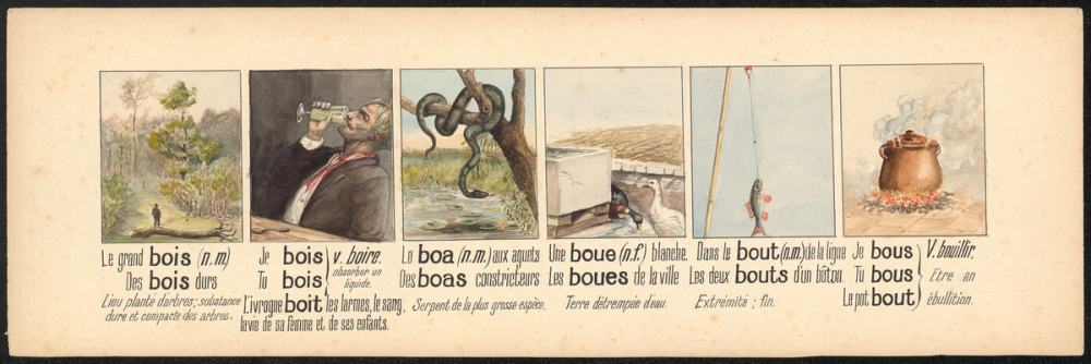 Représentations : bois, boa, pêche à la ligne, marmite / Les vignettes illustrent dans l'ordre suivant : le grand bois ; je bois ; le boa ; une boue blanche ; dans le bout de la ligne ; je bous.