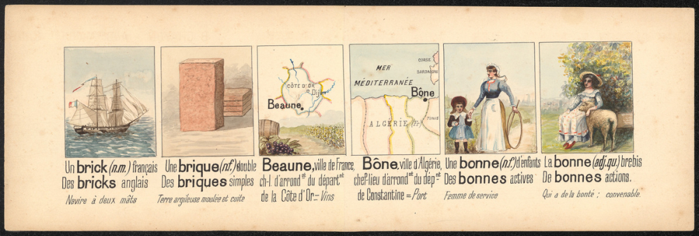 Planche illustrée pour apprendre l'homonymie : brick / brique, Beaune / Bône / bonne