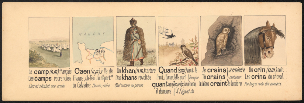 Représentations : camp militaire, Caen, tartare, hirondelle, hibou, cheval / Les vignettes illustrent dans l'ordre suivant : le camp français ; Caen, ville de France ; un khan tartare ; quand vient le froid ; je crains ; un crin noir.