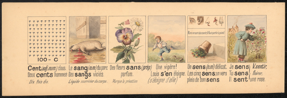 Planche illustrée pour apprendre l'homonymie : cent / sang / sans / s'en / sens