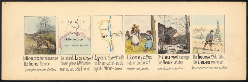 Planche illustrée pour apprendre l'homonymie : lion / Lyon, lieu / lieue